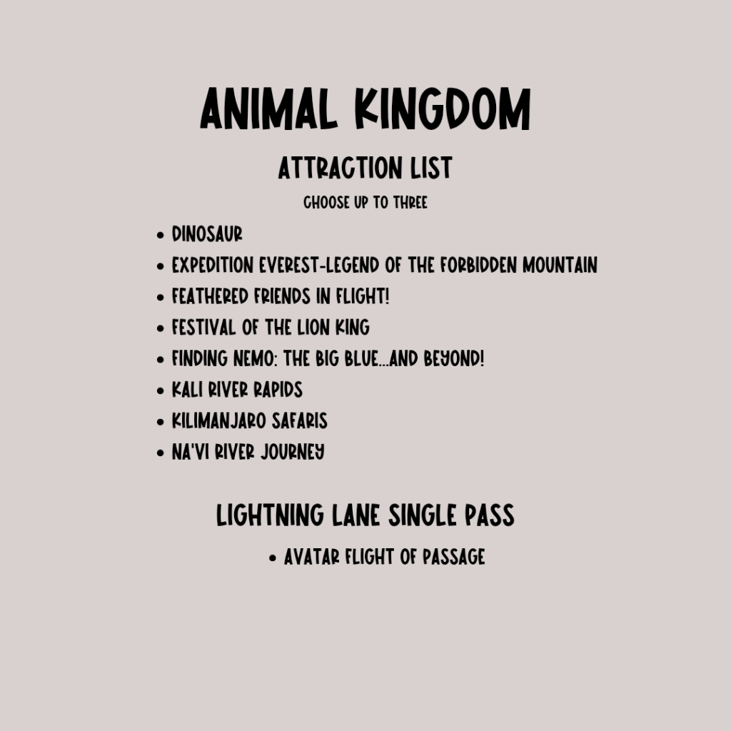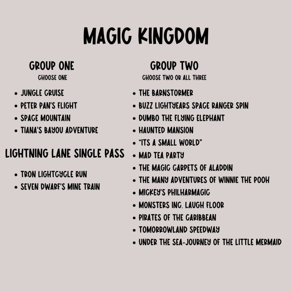 - Magic Kingdom: Prioritize Peter Pan, JUngle Cruise or Tianas Bayou Adventure fpr group one.