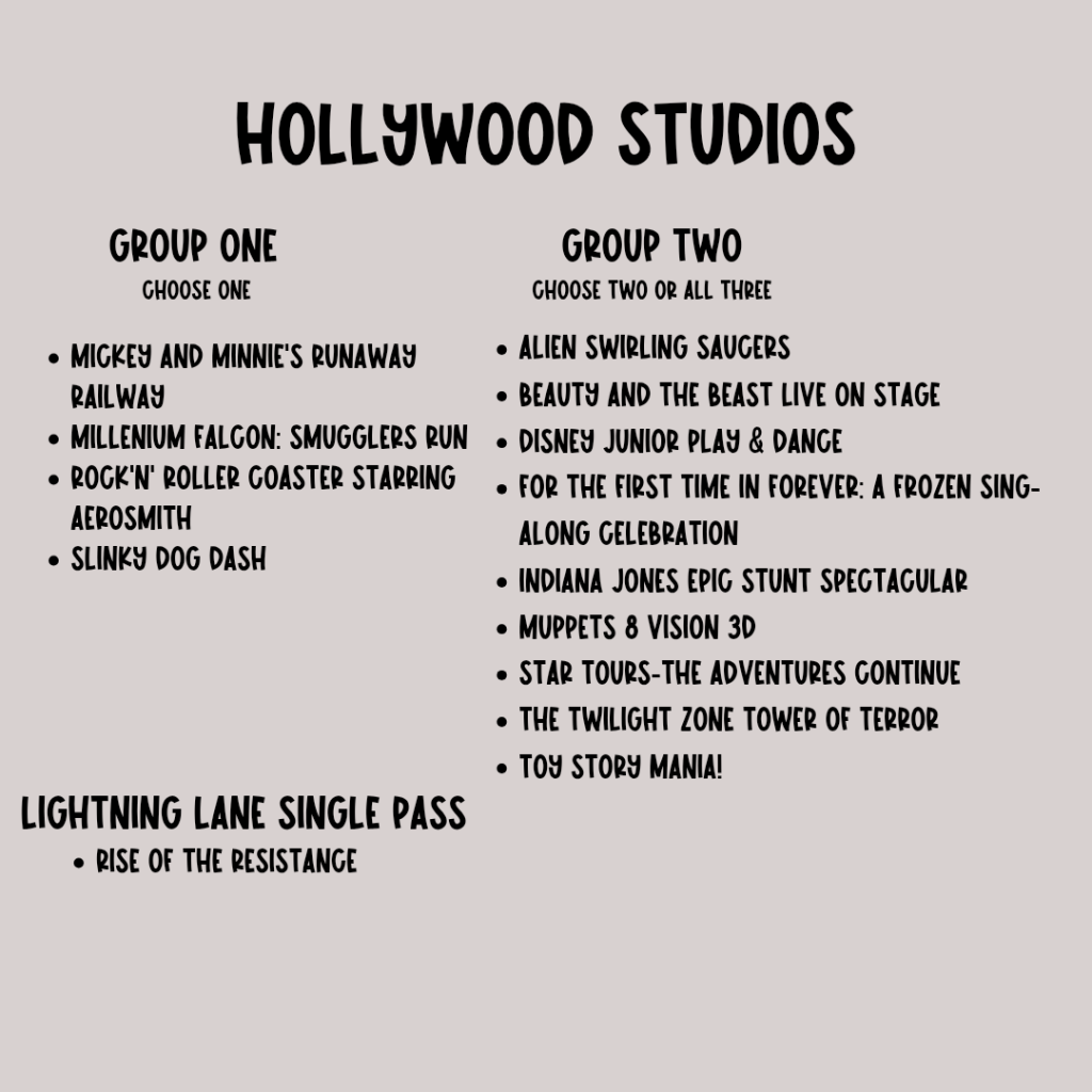 - Hollywood Studios: Choose Slinky Dog Dash or Toy Story Mania first.